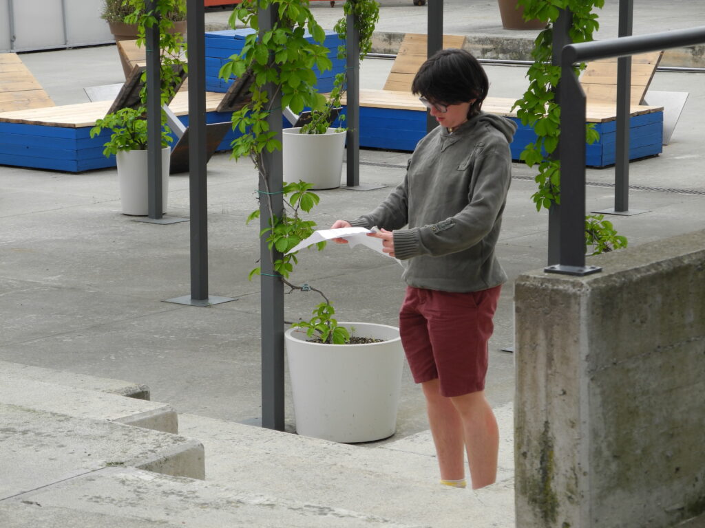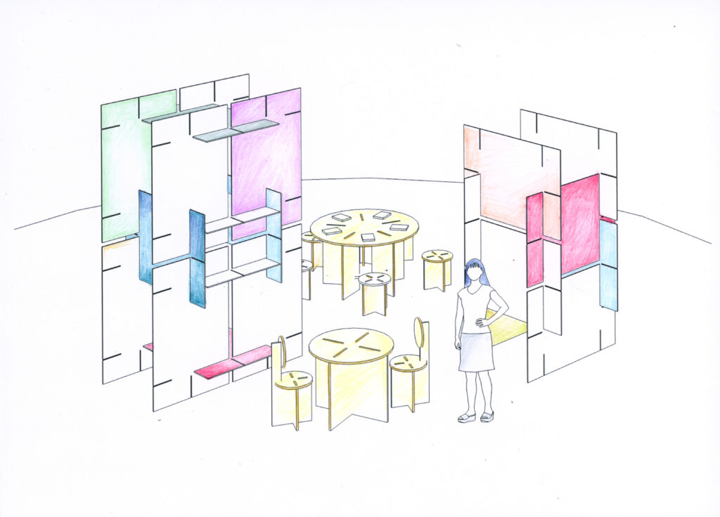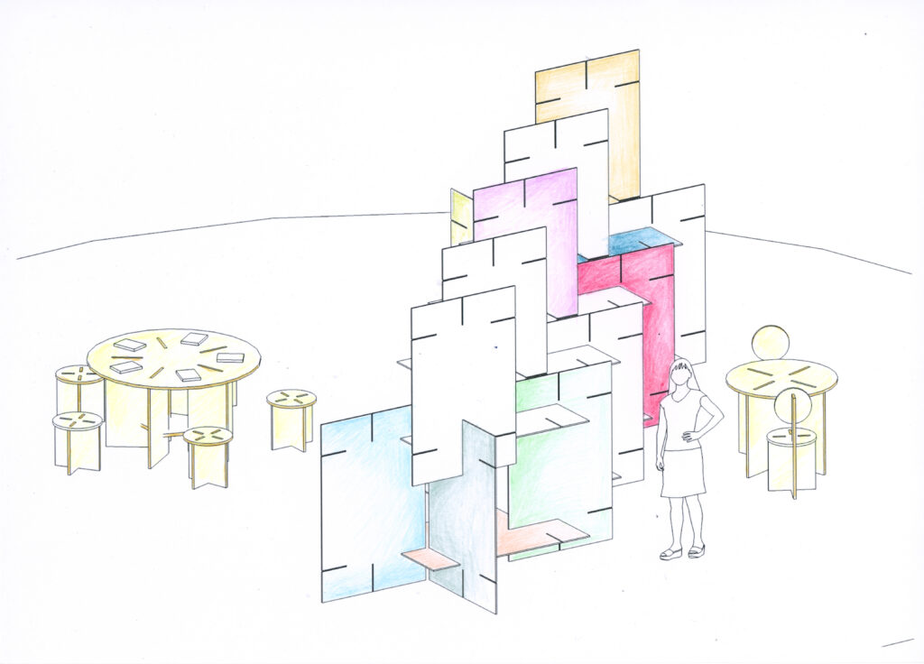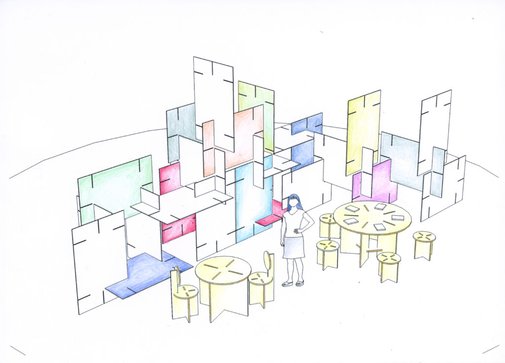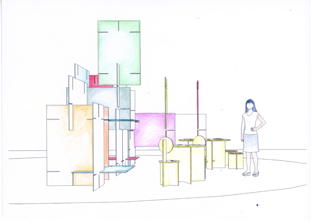 La disposizione dell’installazione nello spazio espositivo verrà decisa attraverso un processo laboratoriale, guidato dall’artista, che coinvolgerà un gruppo di persone del territorio. La progettazione dell’installazione è frutto di un lavoro collettivo che ha coinvolto Hypereden per la progettazione spaziale e Atto Studio per il graphic design, e prevederà la collaborazione di un gruppo di studenti e studentesse di graphic design nella co-progettazione degli elementi visivi e degli oggetti espositivi. Scarica il pdf informativo