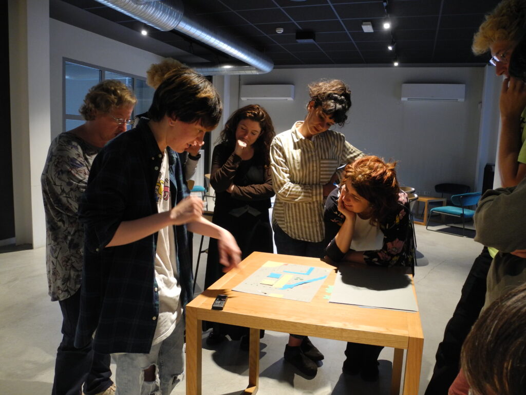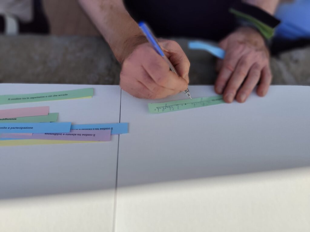 La partecipazione rappresenta il cuore del progetto. L’idea di uno spazio-laboratorio esperienziale è nato durante i confronti e i dialoghi tra l’artista, i ricercatori e le ricercatrici, e gli studenti e studentesse coinvolti nei laboratori. L’installazione, concepita come struttura modulare e adattabile, prenderà forma definitiva attraverso un laboratorio partecipativo guidato dall’artista, in cui un gruppo eterogeneo di persone contribuirà a definire la disposizione nello spazio, in dialogo con ogni luogo che ospiterà il progetto. La mediazione con il pubblico sarà curata da un gruppo di giovani formati dall’artista, che accompagneranno i visitatori durante l’esposizione, in particolare nella postazione interattiva a due, pensata per offrire un’esperienza partecipativa e di riflessione sul tema del confine.